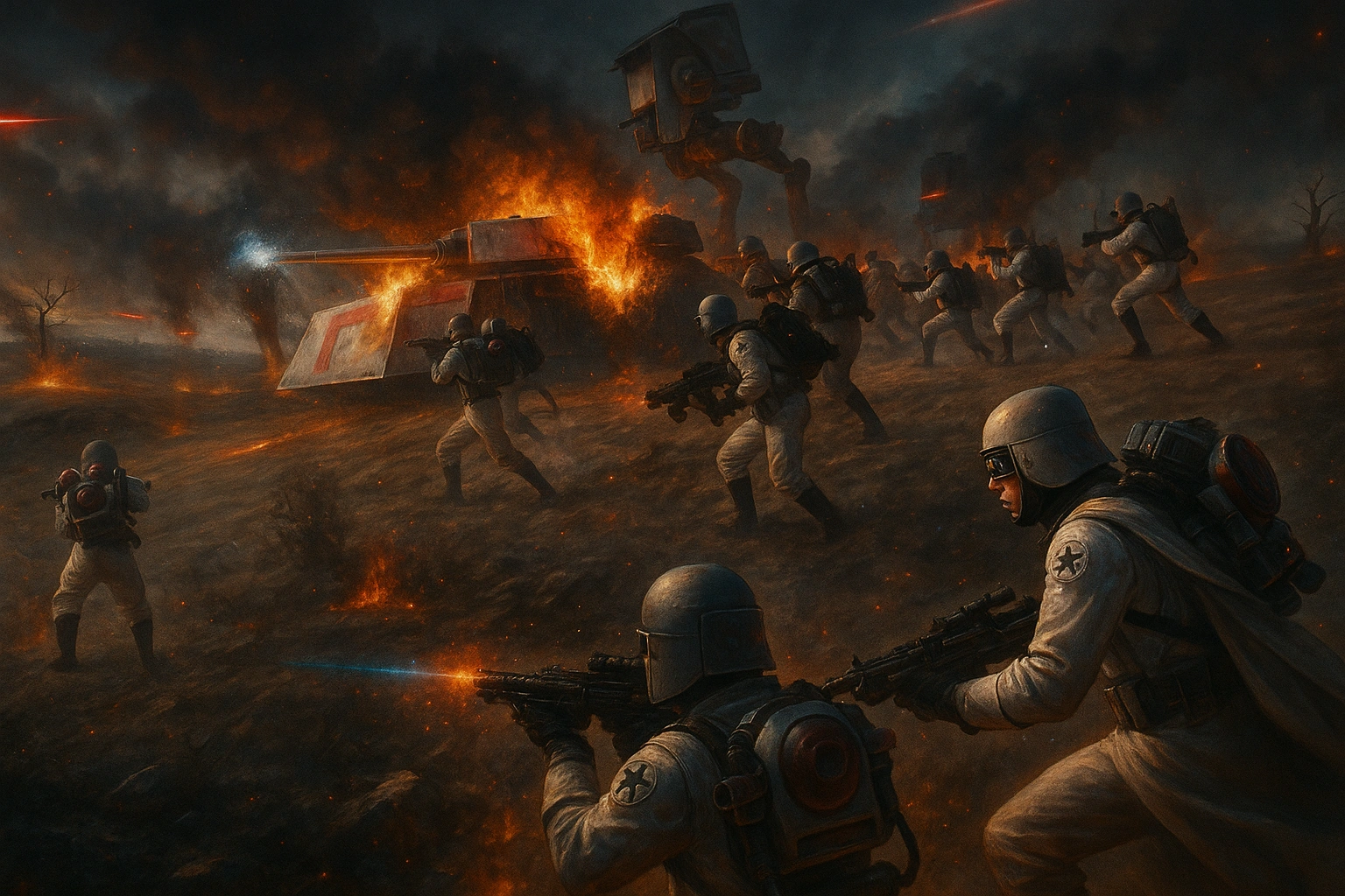 The first wave of Imperial forces arrived without warning, deploying battalions of Army Troopers armed with a hybrid assortment of Clone Wars era blasters and early Imperial weaponry.